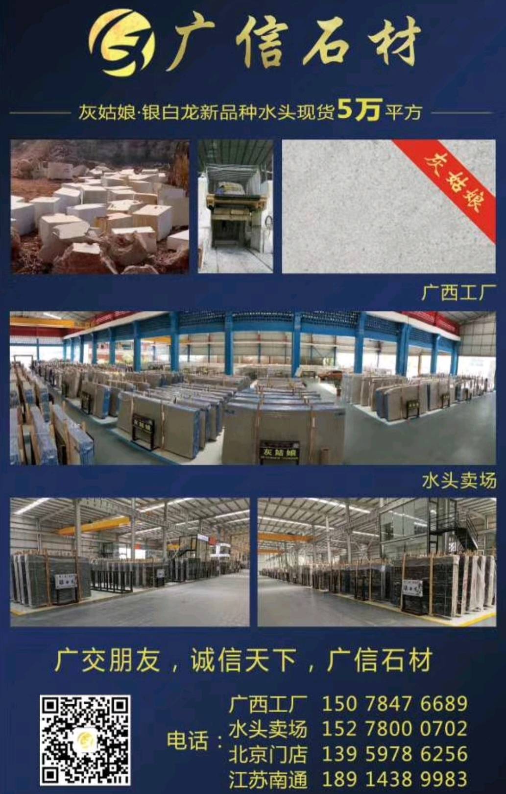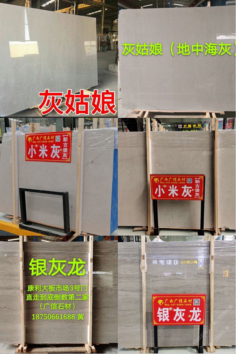 廣信石材有限公司是一家集開采生產,加工,銷售于一體的民營企業(yè),主要經營天然大理石:灰姑娘,地中海灰(大板,條板,規(guī)格板),雅士灰,銀白龍,小米灰,美尼斯灰,新古堡灰,南極灰等各類天然大理石石材。主要銷往以色列,歐美,韓國以及國內工程。礦山廠家直銷,廣西工廠,福建水頭,河北香河,江蘇南通均有銷售點,歡迎您來我們直銷店或則廣西工廠實地考察參觀選購。