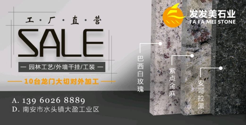 南安發(fā)發(fā)美石雕工藝品有限公司位于324國(guó)道邊大盈工業(yè)區(qū),生產(chǎn)各種進(jìn)口花崗巖,公司擁有10臺(tái)龍門切,全自動(dòng)磨機(jī),5臺(tái)紅外線,承接各種出口花崗巖成品板,條板,歡迎洽談。