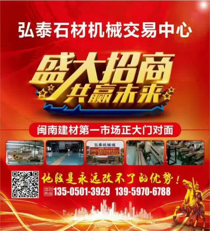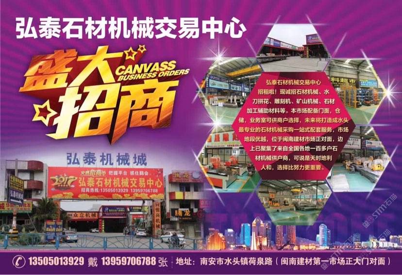 弘泰石材機(jī)械交易中心招租啦!現(xiàn)誠(chéng)招石材機(jī)械、水刀拼花、雕刻機(jī)、礦山機(jī)械、石材加工輔助材料等。本市場(chǎng)配備門面,倉(cāng)儲(chǔ),業(yè)務(wù)室可供商戶選擇,未來(lái)將打造成水頭專業(yè)的石材機(jī)械采購(gòu)一站式配套服務(wù),市場(chǎng)地段優(yōu)越,位于閩南建材市場(chǎng)正對(duì)面,邊上已聚集了來(lái)自全國(guó)各地一百多戶石材機(jī)械供戶商,可說(shuō)是天時(shí)地利人和,選擇比努力更重要。
