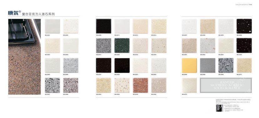 康爾人先后開發(fā)出了色彩豐富的 100% 純亞克力系列,復(fù)合亞克力系列,不飽和樹脂系列,石英石、集成成品臺面和高分子復(fù)合材料門板系列。產(chǎn)品系列多樣、顏色豐富、品質(zhì)穩(wěn)定、已銷往世界幾十個國家,深受國內(nèi)外客戶的好評.