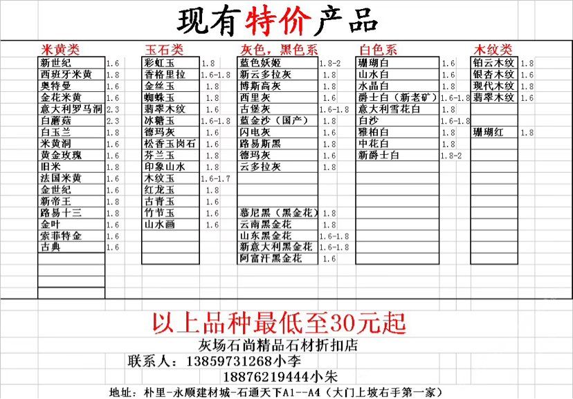 主營四大系列:玉石列、灰色列、米黃列、黑色列。以上產(chǎn)品全部一折起……石材及五金配件對接售后服務(wù)。