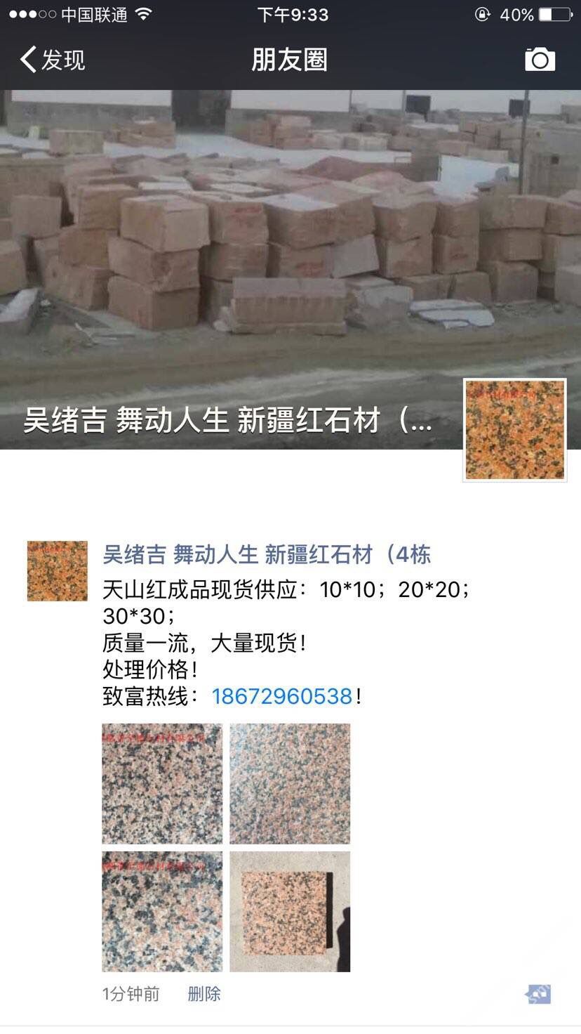 鄯善縣至德石業(yè)有限公司位于美麗的葡萄之鄉(xiāng)~新疆吐魯番鄯善縣鄯善石材工業(yè)園。本公司主要經(jīng)營天山紅,新疆紅,鄯善紅,新疆黃,雪蓮花,灰麻等各類新疆石種,擁有先進(jìn)的生產(chǎn)設(shè)備, 雄厚的技術(shù)力量,是一家集礦山開采,石材加工,銷售于一體的多年老品牌石材公司。本公司還設(shè)石材銷售點(diǎn)于各個(gè)大型建材市場,廣東云浮市思勞,廣東云浮市珠洞,福建省水頭鎮(zhèn)閩南建材市場。承諾滿足不同地區(qū)的采購商多種需求。我們期待您的來電,竭誠歡迎新老客戶共創(chuàng)雙贏。