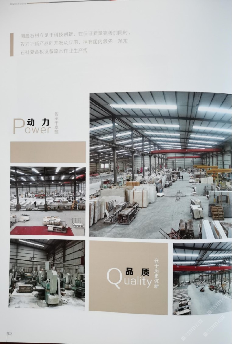 閩晨公司規(guī)模宏大。年產(chǎn)鋁蜂窩復合石材、保溫復合石材、瓷磚復合石材、透光復合石材、石線和傳統(tǒng)平板石材50萬平方米。公司2018年與九天龍公司融股聯(lián)合,生產(chǎn)保溫石材復合板,給公司輸入了新的動能和產(chǎn)能,增強了公司新的技術(shù)含量,把公司的業(yè)務(wù)與影響擴展到祖國的大江南北,招引了大量北方客戶,在激烈的行業(yè)競爭中公司以超前創(chuàng)新的技術(shù),優(yōu)良人性化的服務(wù),質(zhì)優(yōu)價美的產(chǎn)品,疑難技術(shù)的解惑和售后服務(wù)贏得了客戶的好評與信賴。