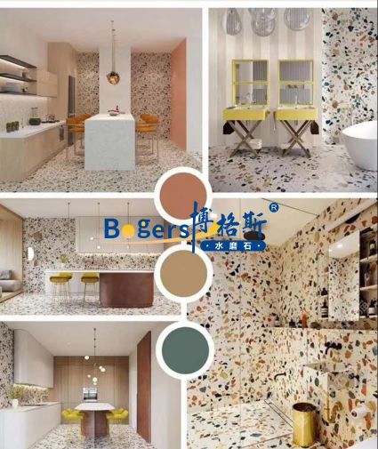 隨著工藝水平和材料品質(zhì)的巨大突破,新型預(yù)制無機(jī)水磨石采用環(huán)保型無機(jī)粘劑,不含樹脂膠水等,通過高頻高壓抽真空震動(dòng)壓制而成,硬度更高更耐磨,施工更靈活方便。憑借其時(shí)髦大氣的設(shè)計(jì)呈現(xiàn)出一種慢慢的感