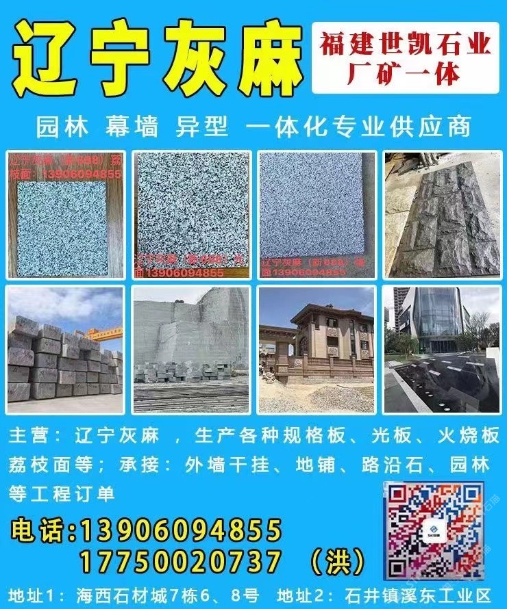 主營(yíng)石種:遼寧灰麻(新688) 、 芝麻黑(新G654) ,長(zhǎng)期儲(chǔ)存5000~10000立方荒料,滿足各大石材工程需求。從荒料開(kāi)采到成品呈現(xiàn),產(chǎn)品涉及園林、幕墻、異型等各類(lèi)工程訂單,廠礦一體,公司下設(shè)荒料堆場(chǎng)部,市場(chǎng)營(yíng)銷(xiāo)部,工廠配備專(zhuān)業(yè)生產(chǎn)先進(jìn)機(jī)械設(shè)備。25年來(lái)專(zhuān)注于各種天然石材加工、成品、銷(xiāo)售。現(xiàn)已成為專(zhuān)業(yè)國(guó)內(nèi)外石材供應(yīng)商,本著“誠(chéng)信為本,合作共贏”經(jīng)營(yíng)理念,為廣大客戶提供生產(chǎn)配套以及大型施工安裝一條龍服務(wù)!