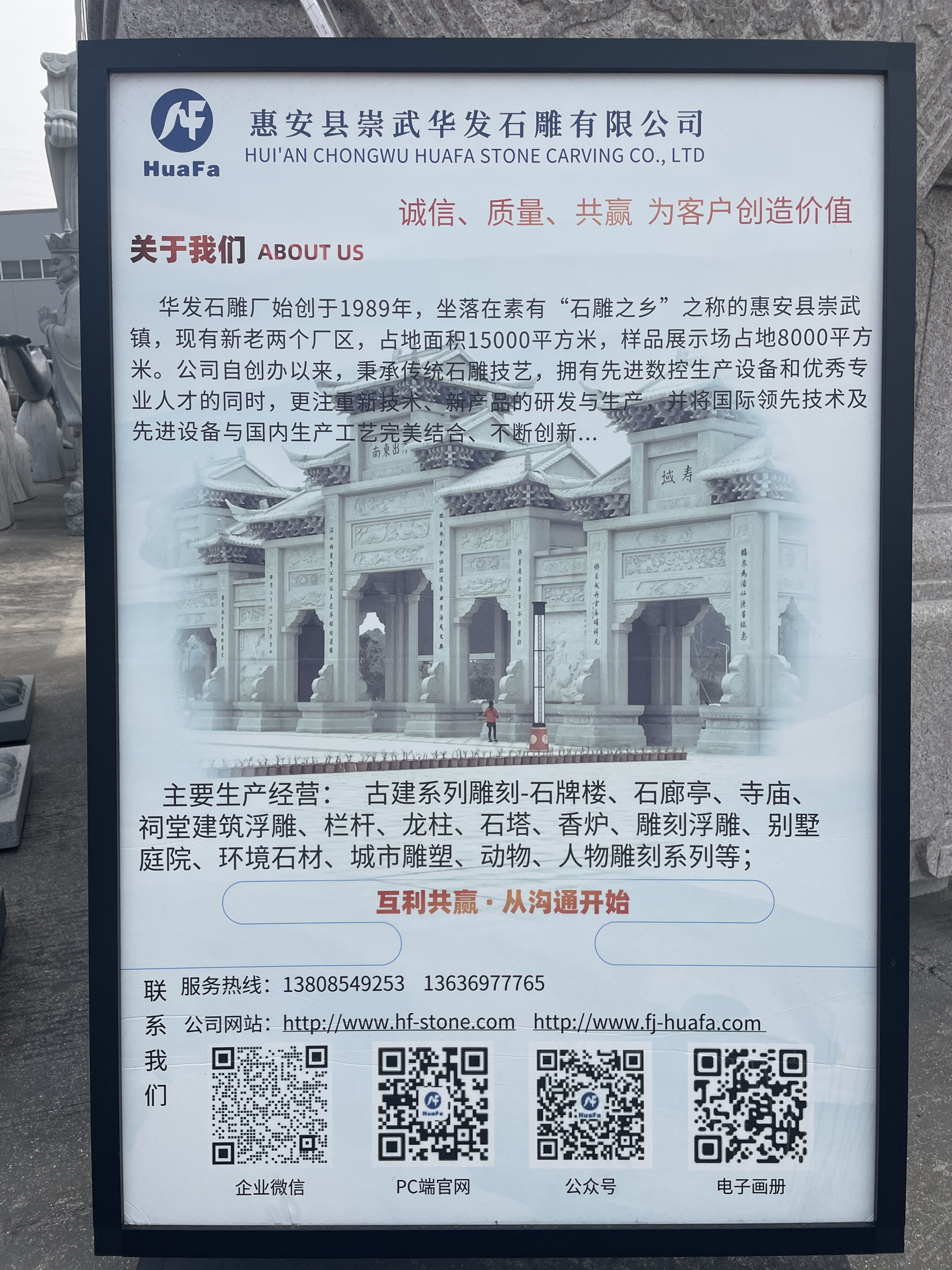 華發(fā)石雕廠始創(chuàng)于1989年,現(xiàn)有新老兩個廠區(qū),占地面積15000平方米,樣品展示場占地8000平方米。公司自創(chuàng)辦以來,秉承傳統(tǒng)石雕技藝,匯集了一批專業(yè)技術(shù)人才,企業(yè)實行科學(xué)的質(zhì)量管理體系。