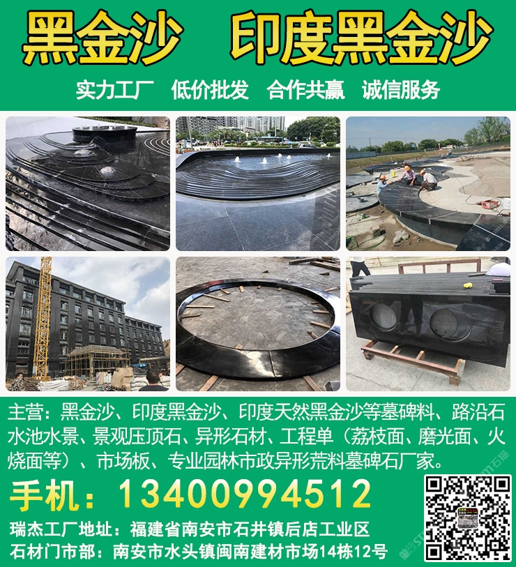 發(fā)布信息: 瑞杰黑金沙林總13400994512專業(yè)印度黑金沙供應商,實力石材工廠主要加工:黑金沙、黑金砂、印度黑金沙、印度天然黑金沙、印度黑色石材、印度黑石、黑金沙石材、黑金沙花崗巖、新礦黑金砂、國產(chǎn)黑金沙、新黑金沙石材等墓碑料、路沿石、水池水景、景觀壓頂石、異形石材、工程單(荔枝面、磨光面、火燒面等)、市場板、專業(yè)園林市政異形荒料墓碑石廠家,實力工廠、低價批發(fā)、合作共贏、誠信服務. 工廠地址:福建省南安市石井鎮(zhèn)后店工業(yè)區(qū),門市部:南安市水頭鎮(zhèn)閩南建材市場