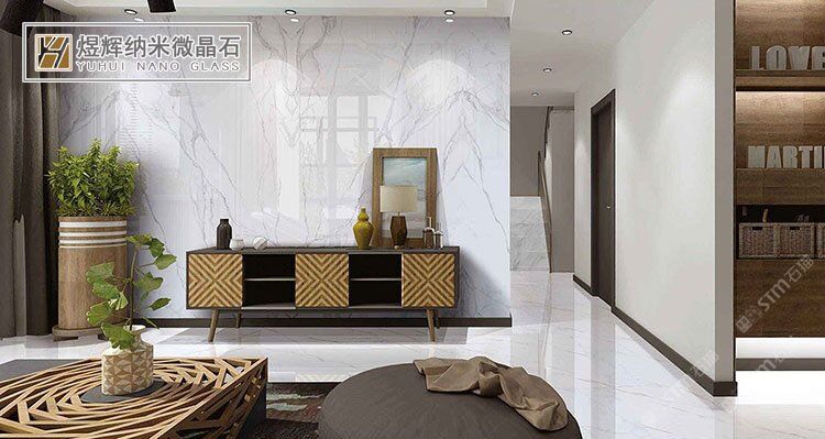 魚肚白微晶石電視背景墻,巖板熱彎加工,影視墻地臺