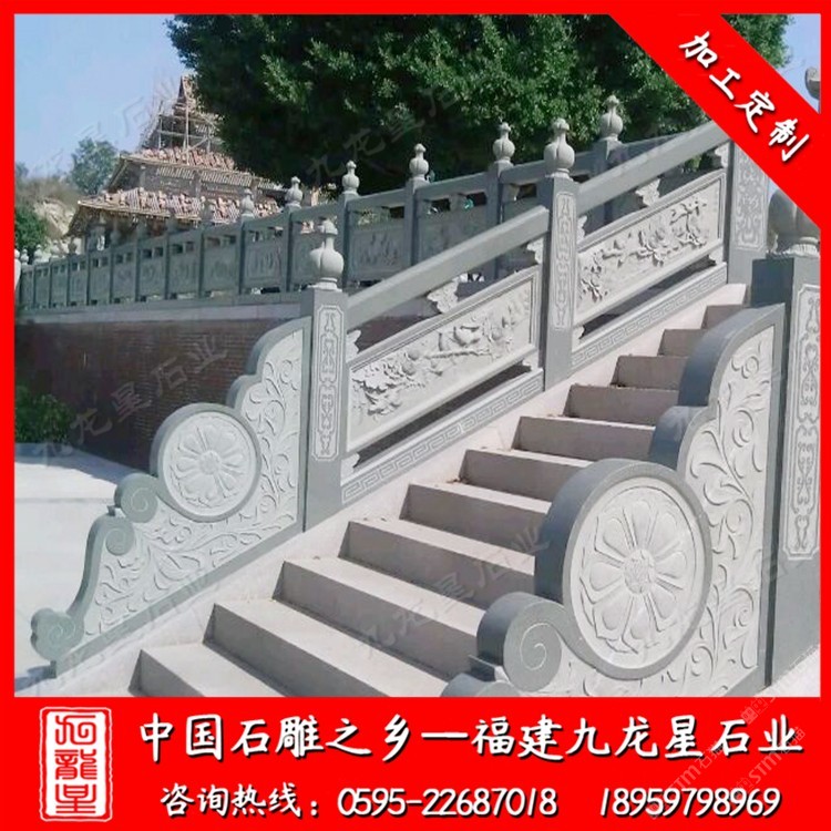 發(fā)布信息: 九龍星石業(yè)常年批發(fā)石材欄桿護(hù)欄,寺廟欄桿、別墅欄桿、景區(qū)石雕護(hù)欄、河道池塘欄桿護(hù)欄、公路石雕護(hù)欄等等。歡迎咨詢我們,我們會(huì)發(fā)您一些適合您的石材欄桿護(hù)欄圖片,并為您做出報(bào)價(jià)(18959798969微信同號(hào))。 石材欄桿護(hù)欄使用天然石材雕刻制作,使用壽命長(zhǎng),可塑性非常強(qiáng),可以制作成方形、圓形、橢圓形等各種樣式,并可在上面雕刻各式圖案。 石材欄桿護(hù)欄起到防護(hù)安全,在建筑物氣勢(shì)方面起著重要的作用。石欄桿應(yīng)用廣泛,適用于道路、橋梁、河道、堤壩,寺廟等。石雕欄桿主要以花崗巖石材和青石石材較常見。