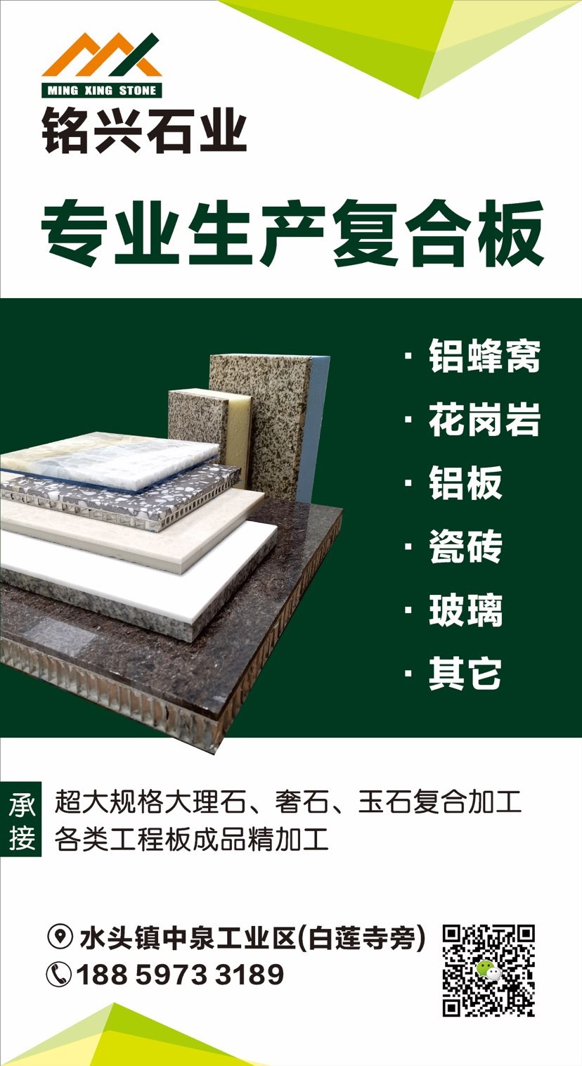 發(fā)布信息: 【銘興復合板】專業(yè)加工各類石材復合板 1.承接大理石/花崗巖復合板工程、幕墻! (鋁蜂窩板、花崗巖、瓷磚,玻纖蜂窩板,人造石、玻璃等) 2.各類超大規(guī)格石材復合板(3800×2100) 供應各類石材復合板成品,來料代加工!