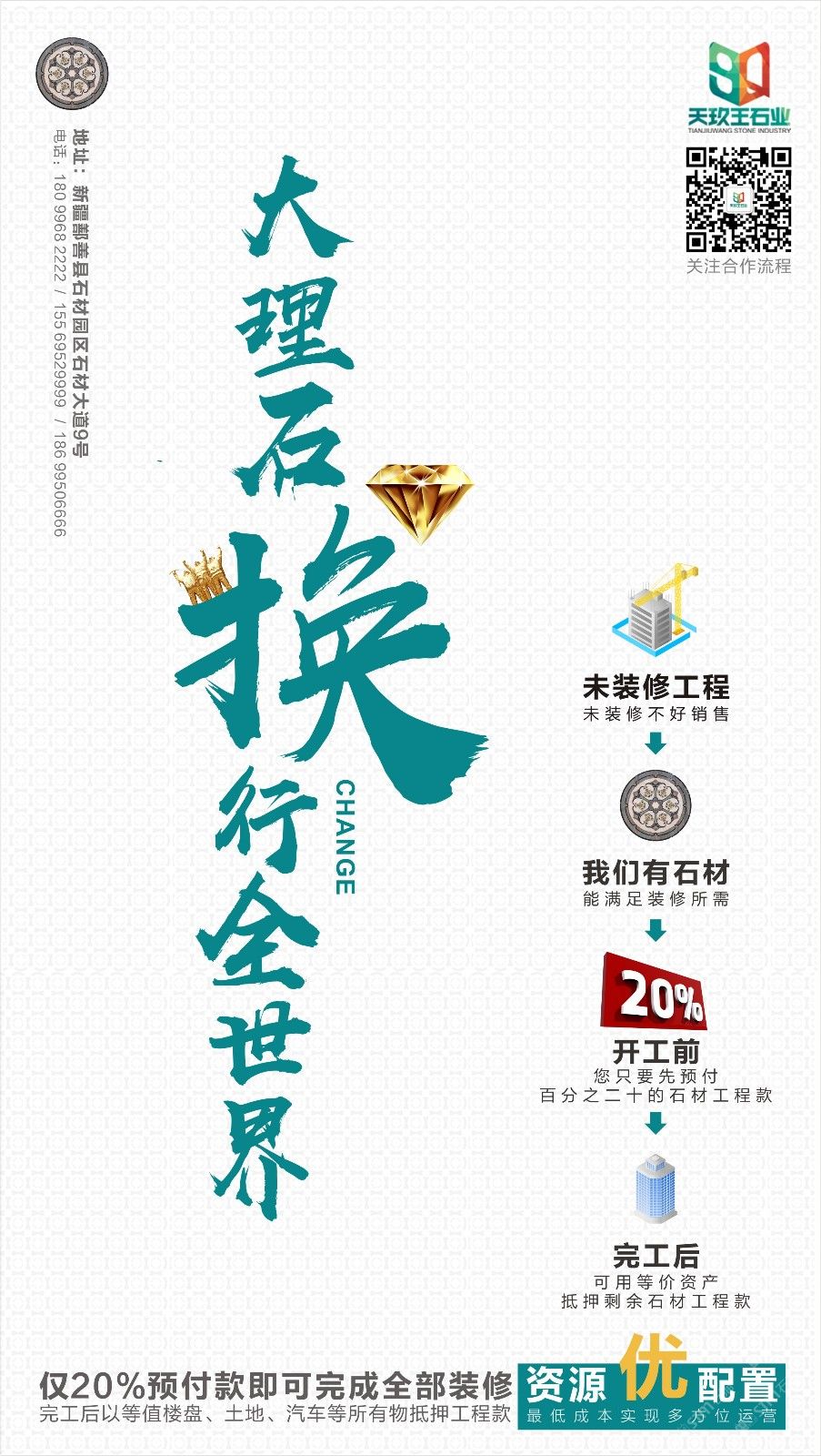 發(fā)布信息: 大理石等值置換資源,抵押工程款! 樓盤、土地、汽車? 只要你想得到的等值資源,就能置換抵押工程款! 工程款未到? 沒關(guān)系,大理石等值置換就能開工! 換醒你沉睡的工程! 資金周轉(zhuǎn)不開? Don't worry, 大理石等值抵押就能盤活你的資本運(yùn)營! 資金緊張,尋求靠譜供應(yīng)商? 讓我來!靠不靠譜你說了算! 只需支付20%預(yù)付款,就能進(jìn)行全部裝修!