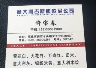 意大利石業(yè)主營產品:雪花白,雪花白3,魚肚白,魚肚白(崗石),意大利灰31,大花白(大理石),銀線米黃,意大利黑金花,舊米黃,萬壽紅,帝諾米黃(直紋)企業(yè)地址:福建泉州南安市水頭鎮(zhèn)蟠龍瀚輝廠